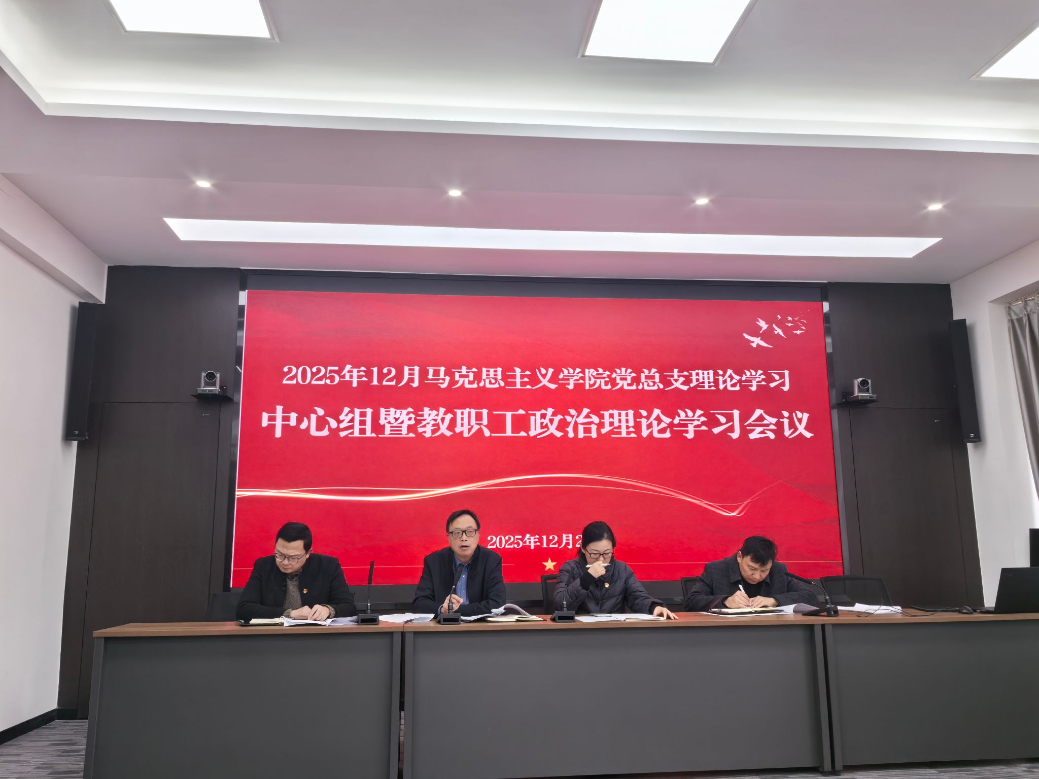 2025年12月26日中午2点,马克思主义学院党总支理论学习中心组及教职工政治理论学习大会在求实楼B310召开。马院处科级干部、全体教职工参加了会议,校党委、行政办公室副主任陈洲,校党委、行政办公室干部吴波列席了会议。本次以习近平总书记关于党的自我革命的重要思想暨全面从严治党重点领域专项整治工作学习部署作为会议学习主题。会议由党总支书记徐继燕主持。